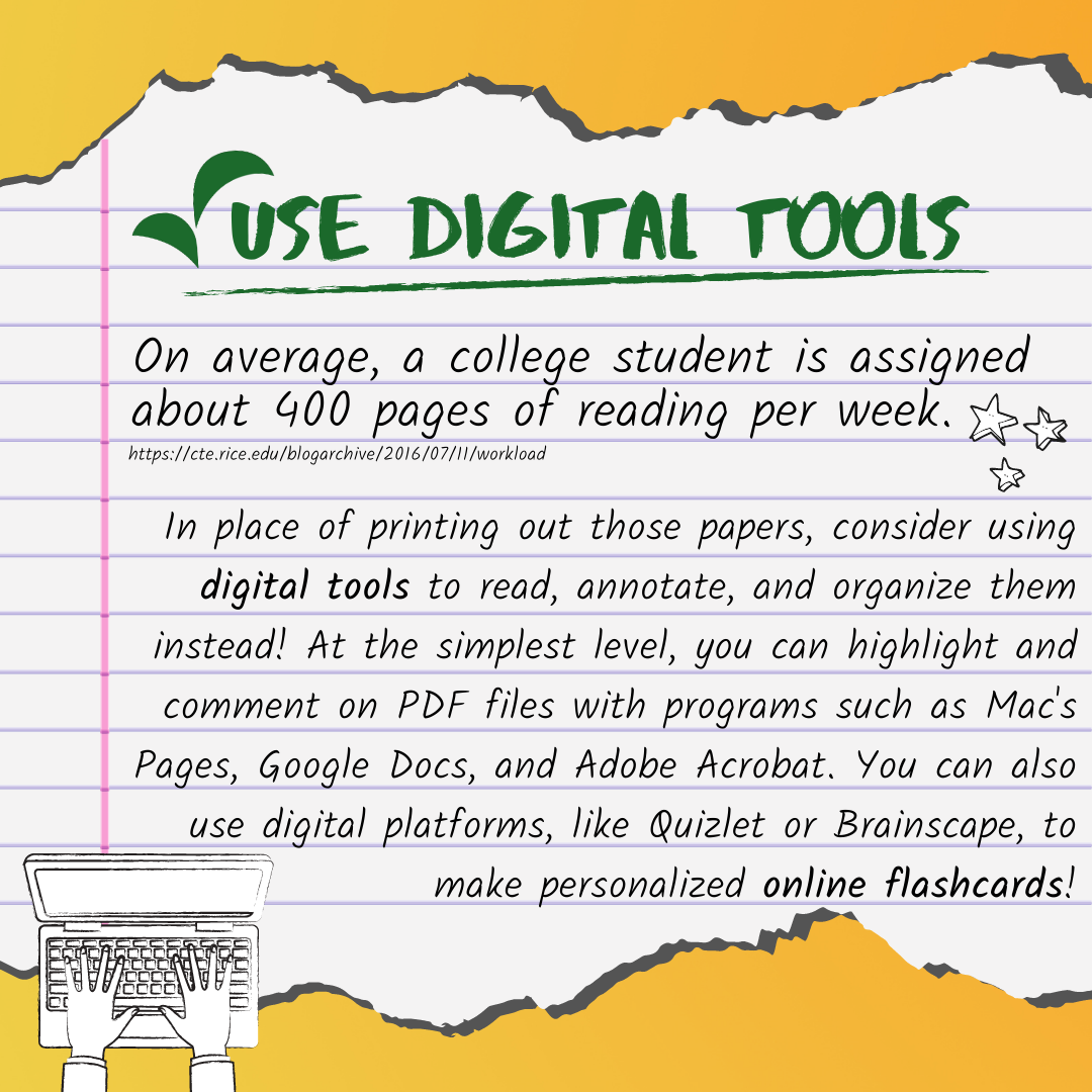 On average, a college student is assigned about 400 pages of reading per week. In place of printing out those papers, consider using digital tools to read, annotate, and organize them instead! At the simplest level, you can highlight and comment on PDF files with programs such as Mac’s Pages, Google Docs, and Adobe Acrobat. You can also use digital platforms, like Quizlet or Brainscape, to make personalized online flashcards!