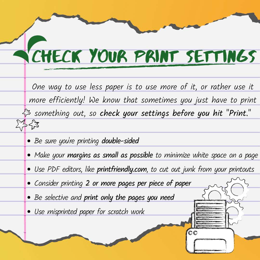 One way to use less paper is to use more of it, or rather use it more efficiently! We know that sometimes you just have to print something out, so check your settings before you hit “Print.”