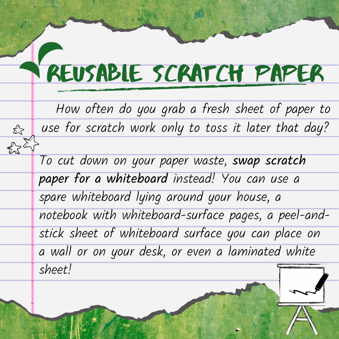How often do you grab a fresh sheet of paper to use for scratch work only to toss it later that day? To cut down on your paper waste, swap scratch paper for a whiteboard instead! You can use a spare whiteboard lying around your house, a notebook with whiteboard-surface pages, a peel-and-stick sheet of whiteboard surface you can place on a wall or on your desk, or even a laminated white sheet!