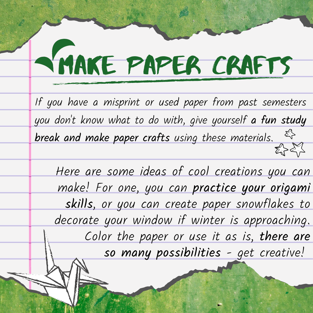 If you have a misprint or used paper from past semesters you don’t know what to do with, give yourself a fun study break and make paper crafts using these materials.