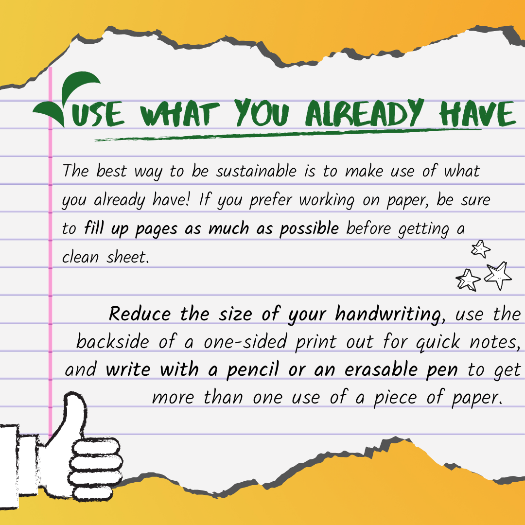 The best way to be sustainable is to make use of what you already have! If you prefer working on paper, be sure to fill up pages as much as possible before getting a clean sheet. Reduce the size of your handwriting, use the backside of a one-sided print out for quick notes, and write with a pencil or an erasable pen to get more than one use of a piece of paper.