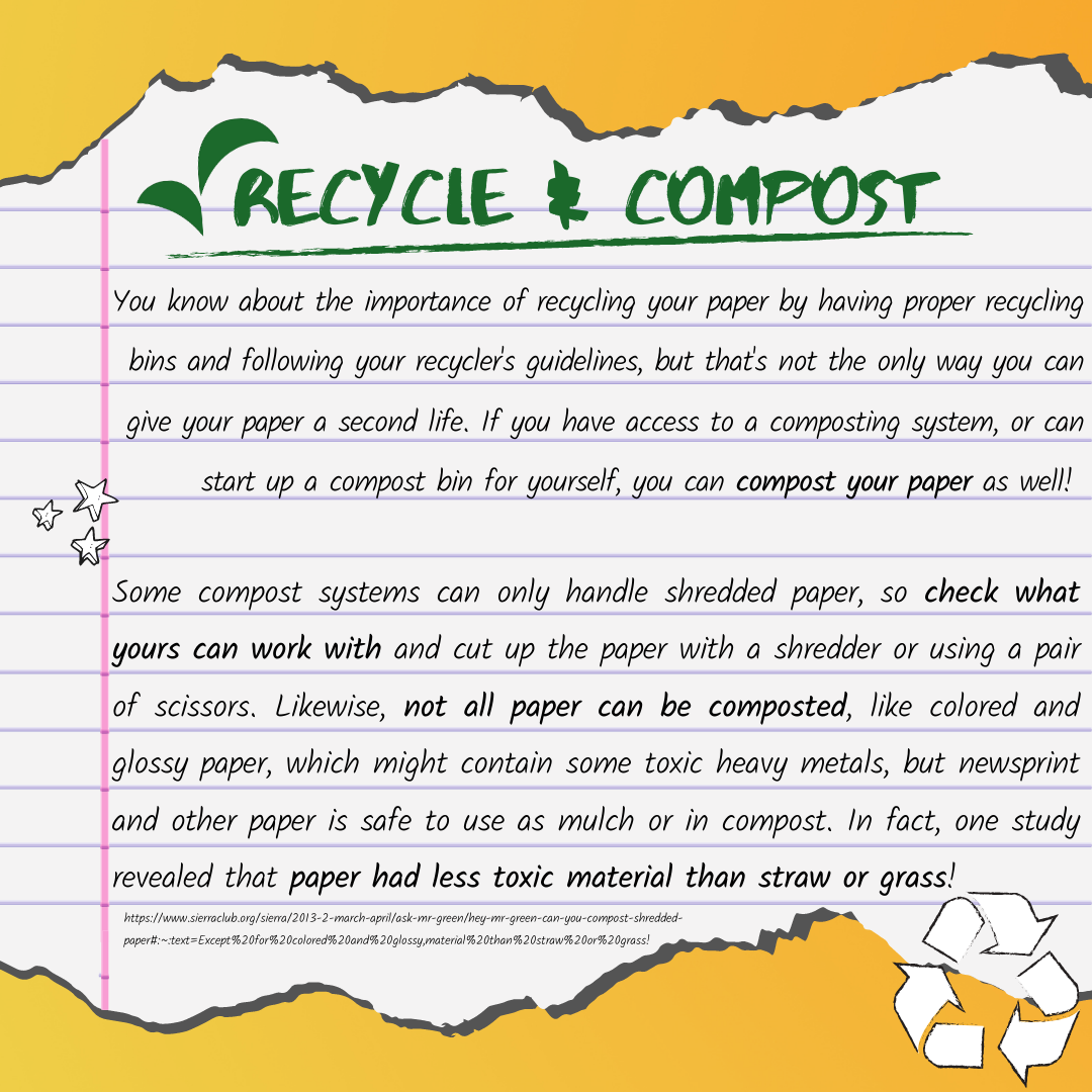You know about the importance of recycling your paper by having proper recycling bins and following your recycler’s guidelines, but that’s not the only way you can give your paper a second life. If you have access to a composting system, or can start up a compost bin for yourself, you can compost your paper as well!