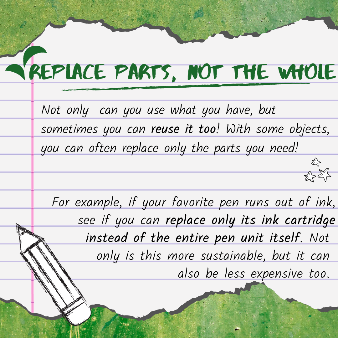 Not only can you use what you have, but sometimes you can reuse it too! With some objects, you can often replace only the parts you need! For example, if your favorite pen runs out of ink, see if you can replace only its ink cartridge instead of the entire pen unit itself. Not only is this more sustainable, but it can also be less expensive too.