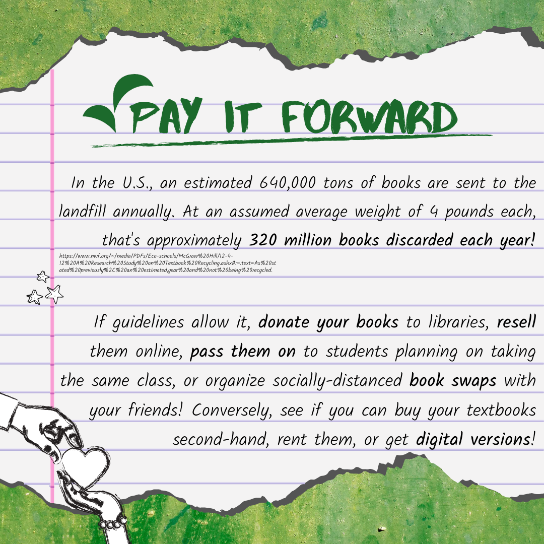 If guidelines allow it, donate your books to libraries, resell them online, pass them on to students planning on taking the same class, or organize socially-distanced book swaps with your friends! Conversely, see if you can buy your textbooks second-hand, rent them, or get digital versions!