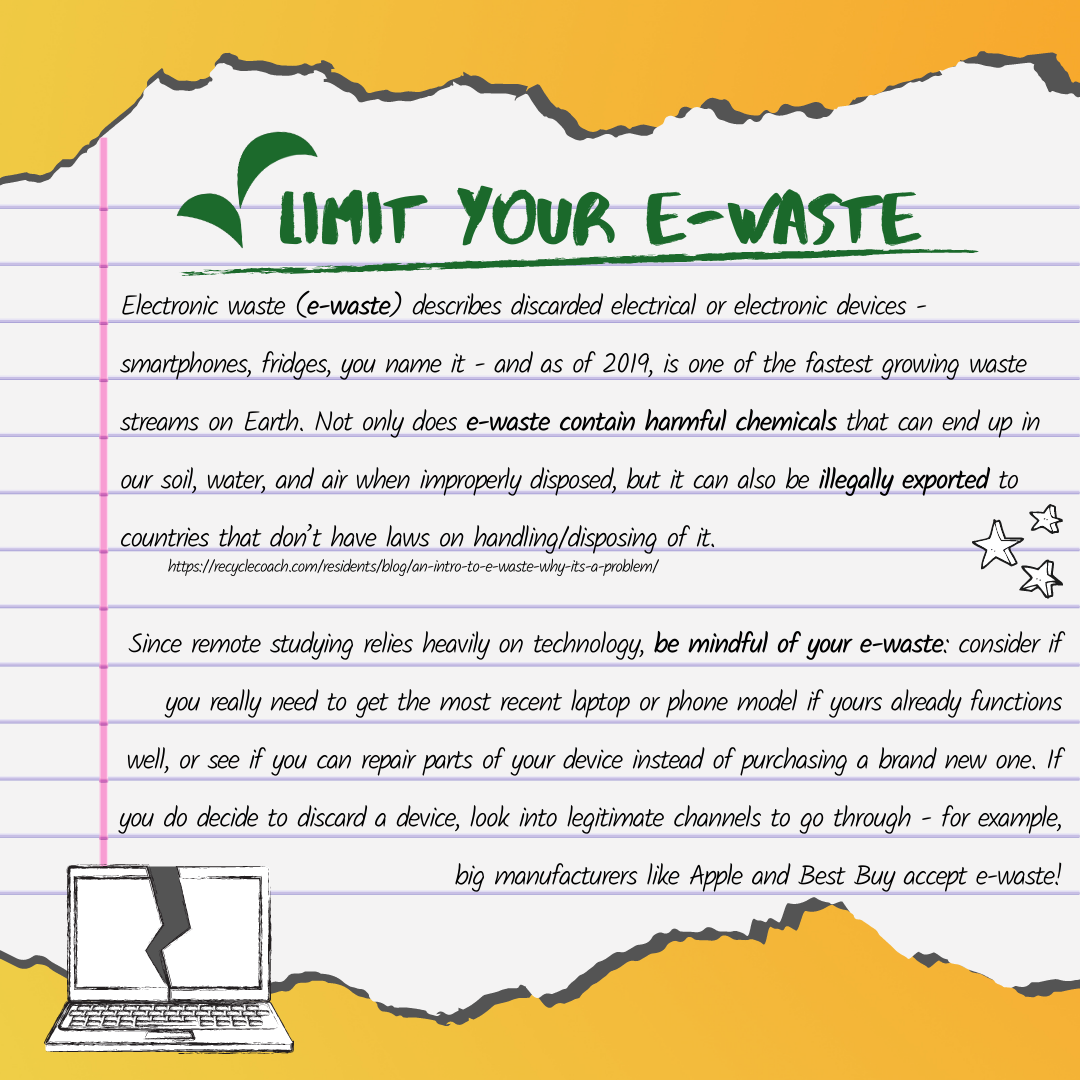 Electronic waste (e-waste) describes discarded electrical or electronic devices – smartphones, fridges, you name it – and as of 2019, is one of the fastest growing waste streams on Earth. Not only does e-waste contain harmful chemicals that can end up in our soil, water, and air when improperly disposed, but it can also be illegally exported to countries that don’t have laws on handling/disposing of it. Since remote studying relies heavily on technology, be mindful of your e-waste: consider if you really need to get the most recent laptop or phone model if yours already functions well, or see if you can repair parts of your device instead of purchasing a brand new one. If you do decide to discard a device, look into legitimate channels to go through – for example, big manufacturers like Apple and Best Buy accept e-waste!