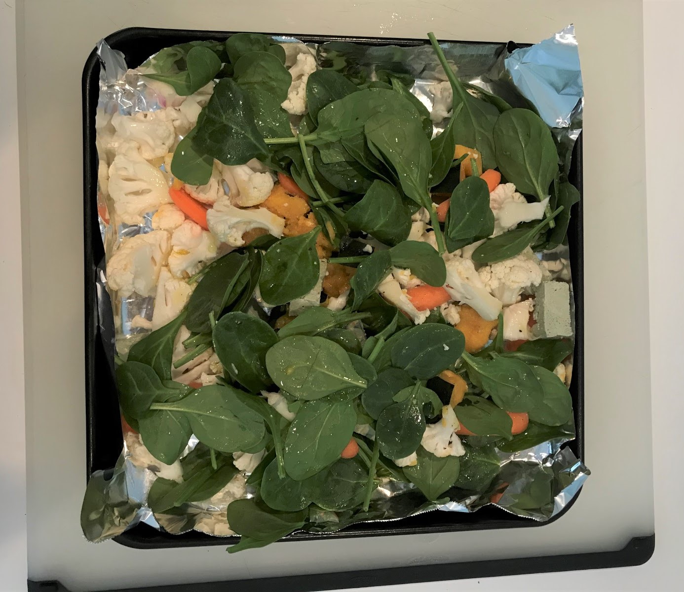 Step 1: First, I roast my protein and vegetables. I chop up a piece of pumfu and mix it with my cut-up veggies; I toss it with a dash of salt, pepper, and a few drops of oil. I put it all on a tray in a toaster oven at 175 °C (350 °F) for 10 minutes.