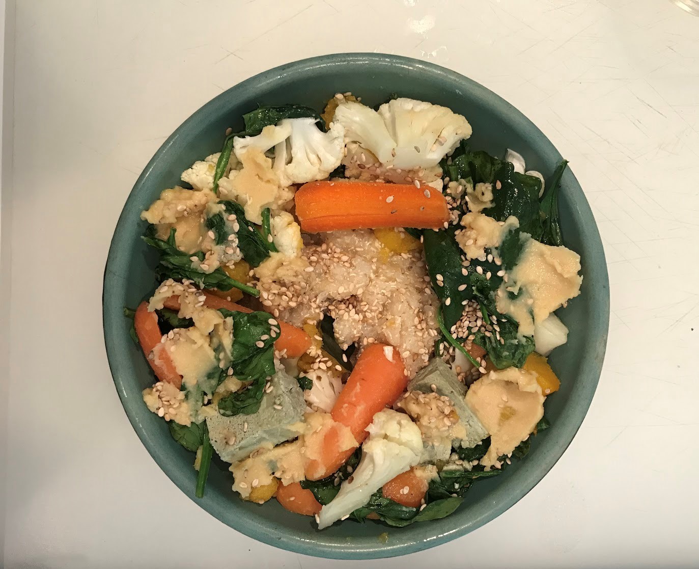 Step 3: Make the dressing! This is super flexible depending on your taste buds; I used some hummus and sesame seeds, but tahini sauce is also super popular.