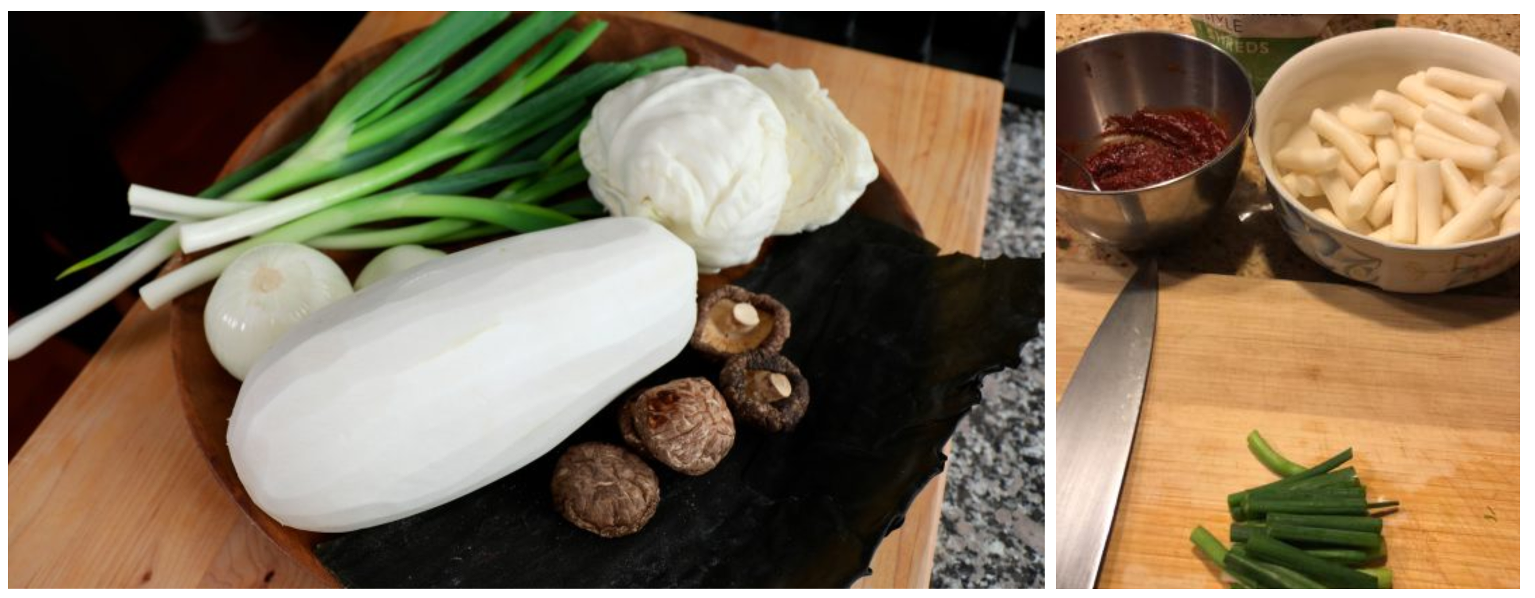 Step 3: Pour around 2 ½ cups of the vegetable stock you made in Steps 1 and 2 into a pot. Mix the red pepper paste, pepper flakes, and sugar in a small bowl and add to the vegetable stock. Add the rice cakes and chopped green onions as well.