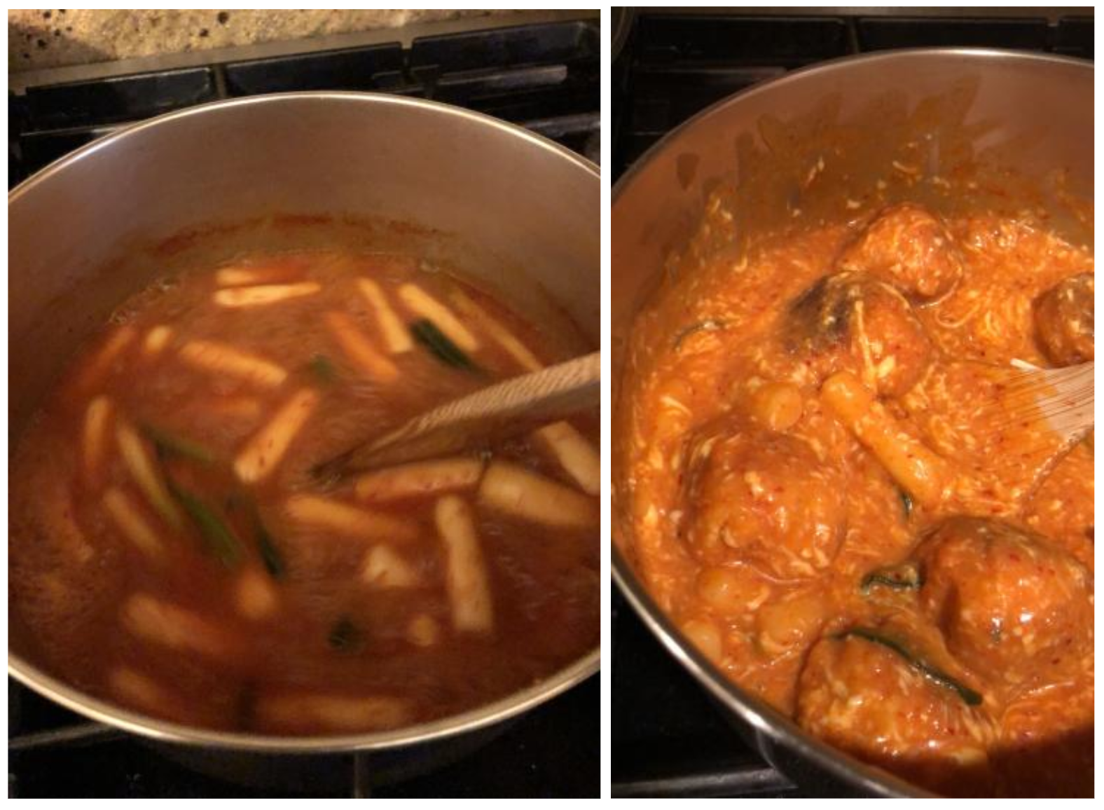Step 4: Cook uncovered over medium high heat. When it begins to boil, stir gently and continue stirring until the rice cakes are soft and the sauce thickens (10-15 minutes). If the rice cakes do not soften, add more water and continue stirring. The flatter the pan, the quicker the sauce will thicken as well.