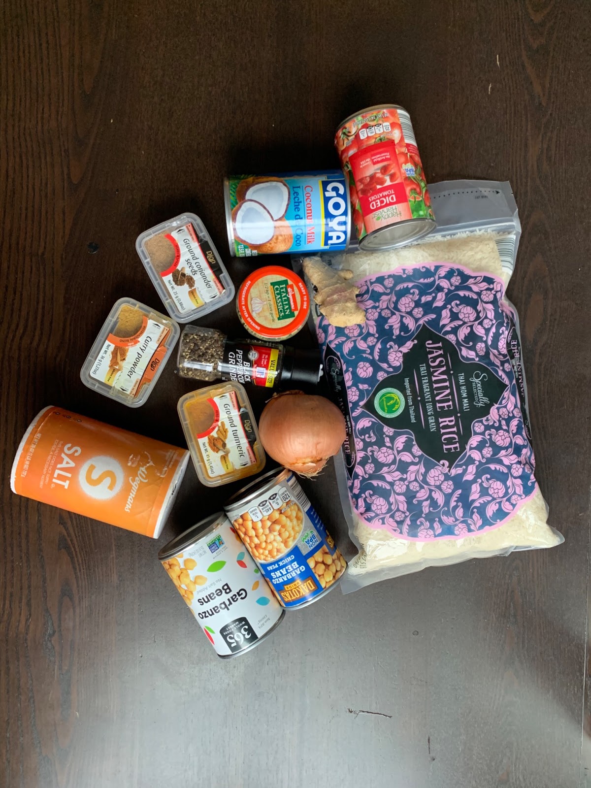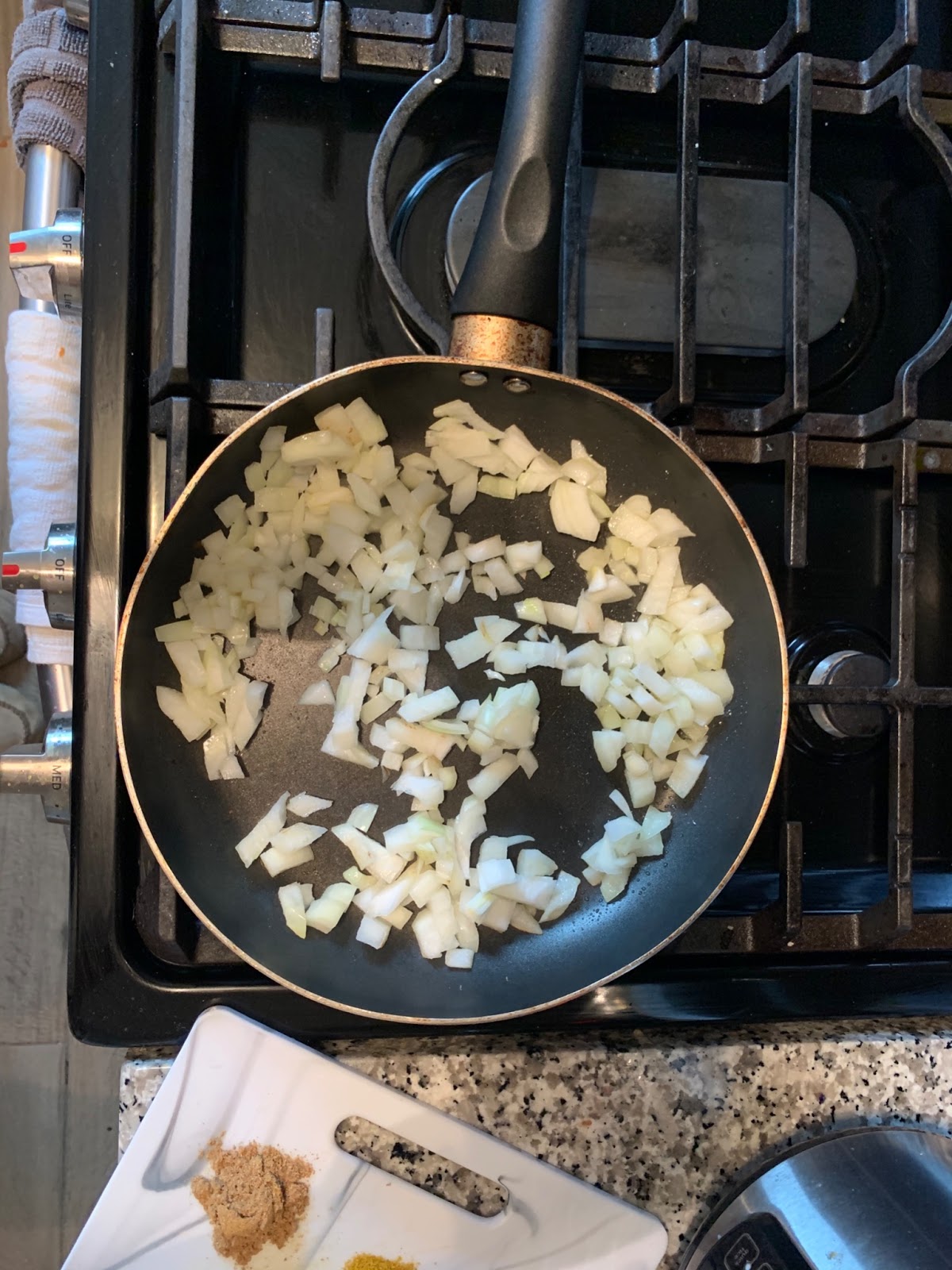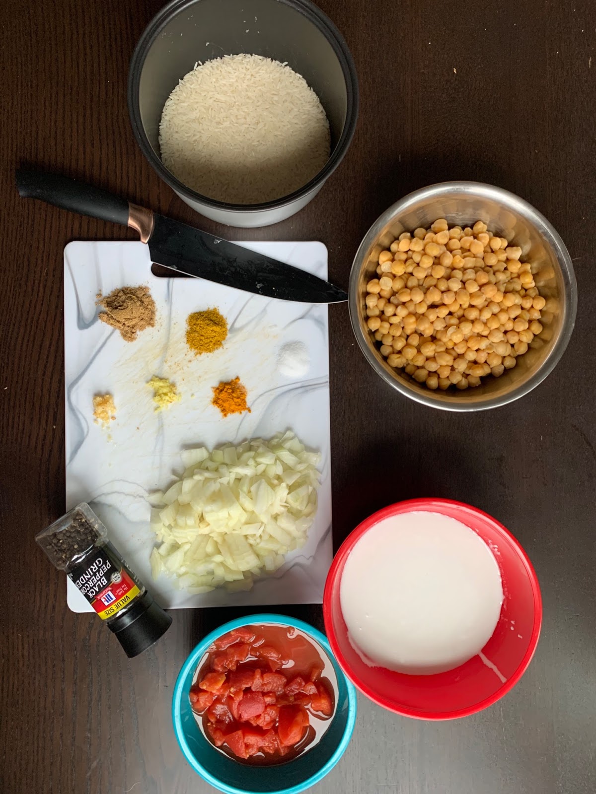 Step 2: Chop the onion and prepare your spices. Drain and rinse the chickpeas.