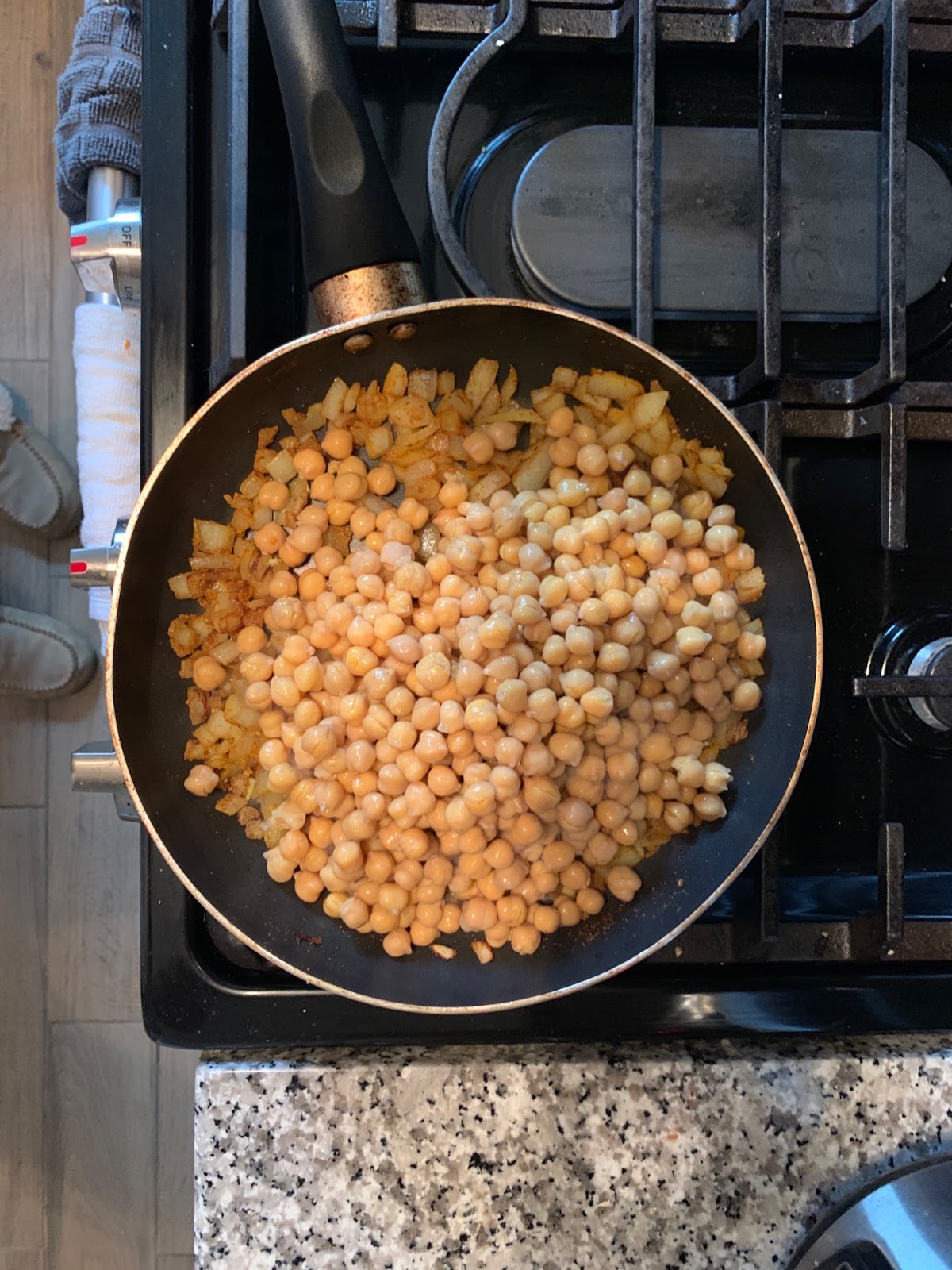 Step 4: Add the spices followed by the chickpeas. Give that just a minute or two to cook.