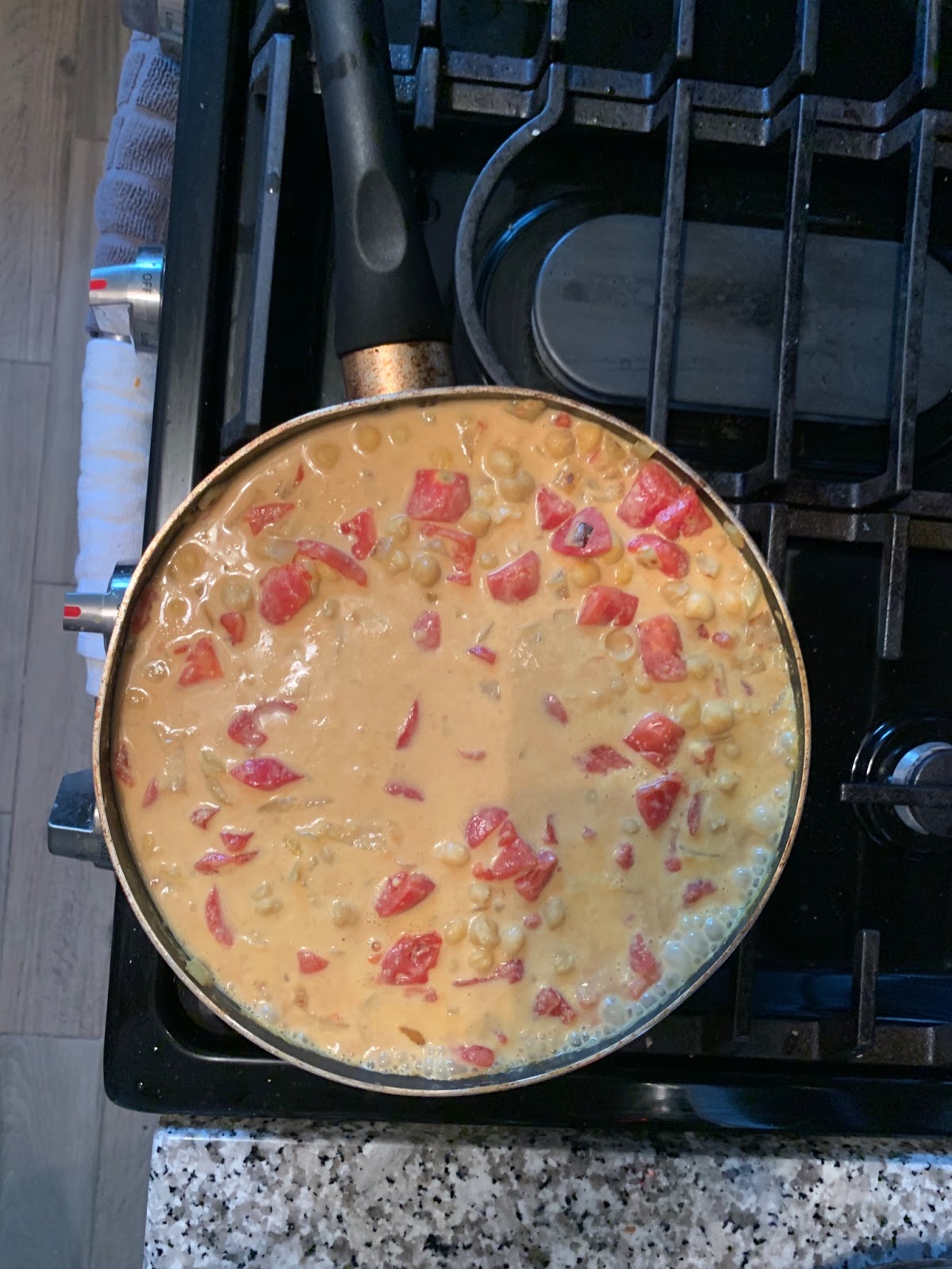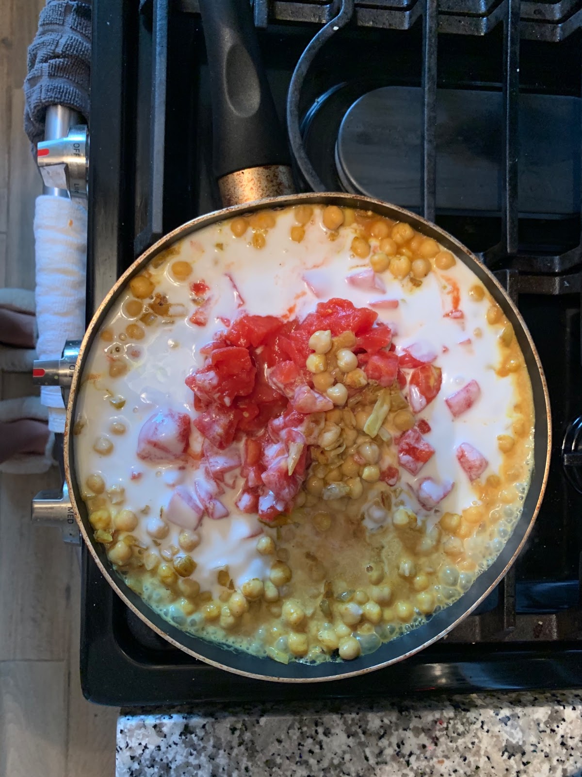 Step 5: Then add the diced tomatoes with all the juices and the coconut milk. Bring to a slight boil and cook for 5-7 minutes. Stir occasionally.