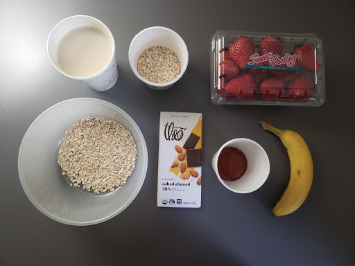 Step 1: To start, combine the oats with the milk and 3 / 4 of the honey. I didn’t have any old-fashioned oats so I substituted instant oats from the U-store. I also used soy milk from the dining hall, though I would have chosen oat milk if it was available. Oat milk is often creamier and uses less water than almond milk. Once combined in a bowl, you can put the bowl in the refrigerator for 15 minutes. If you don’t have access to one like me, it’s perfectly fine without doing so.