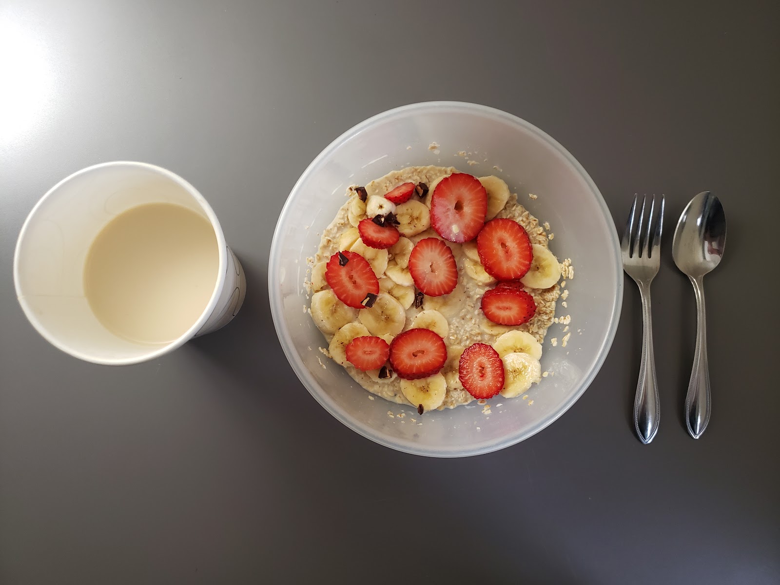 Step 2: Cut up your bananas into coins and strawberries into small pieces. Put these fruit toppings on the oat and milk mixture and add any chocolate, nuts, granola, or fruits you’d like. I had a little honey left over, so I drizzled that on top. Enjoy!