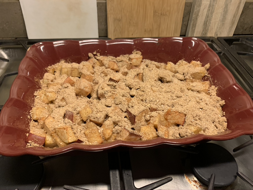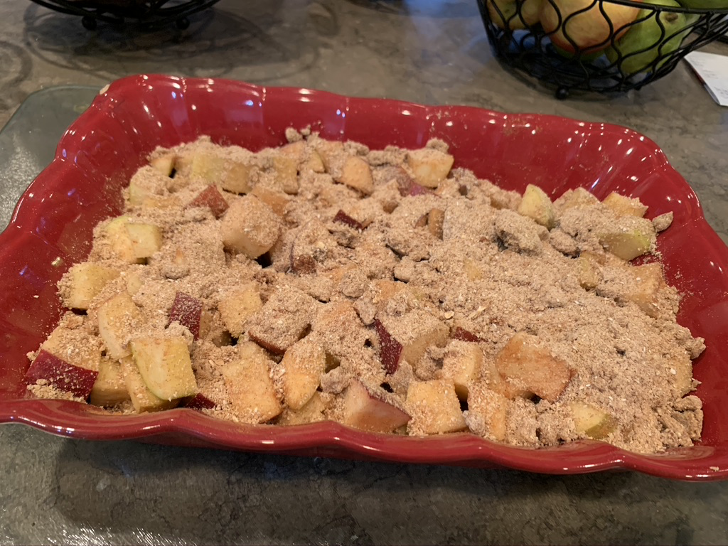 Step 6: Cover apple mixture with crumble.