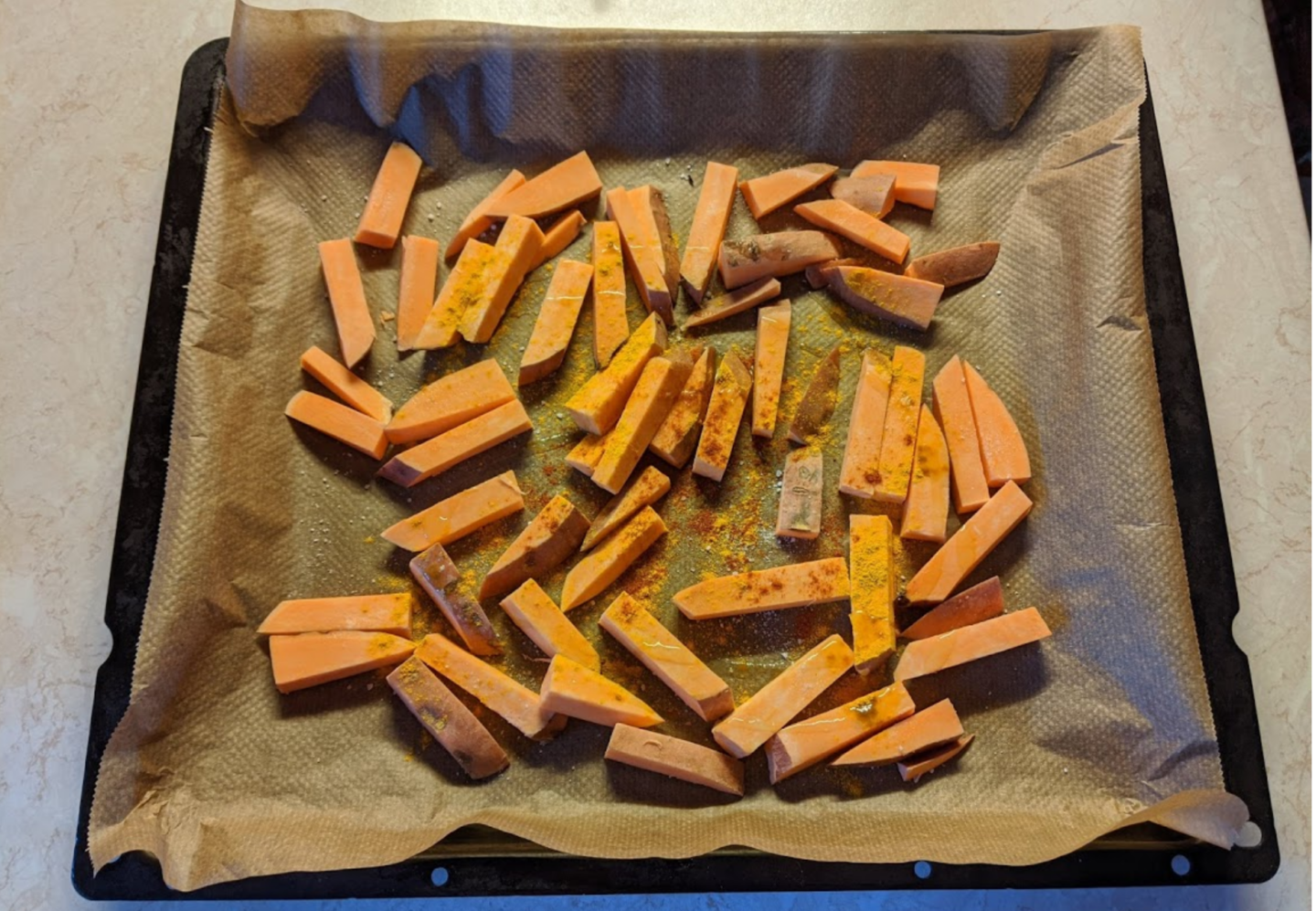 Step 6: Spread the pieces out on the tray so that there is some space between them (otherwise they will not get a nice crust). I could fit one cut-up sweet potato on the tray, so I baked the two in turns.