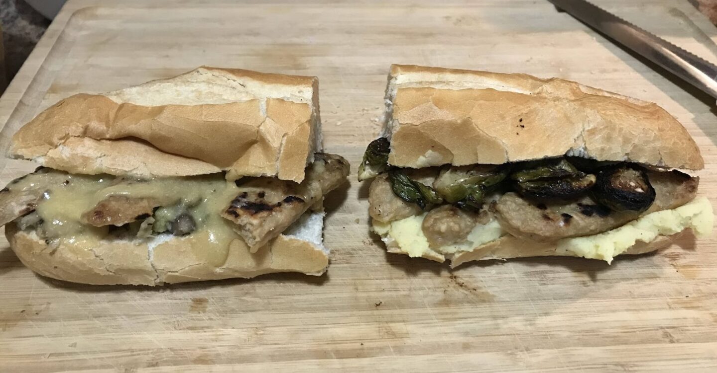 Step 2: Layer on the ingredients. I usually put stuffing or mashed potatoes on the bottom, then vegan turkey/chicken or roasted vegetables on top. If you don’t have your own leftovers or if you want to experiment with some plant-based foods, here are some ideas for sandwich fillings: