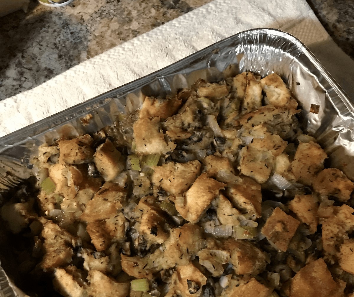 Stuffing: I replaced the butter with Earth Balance and the eggs with 2 tbsp of ground flaxseed mixed with 5 tbsp of water.